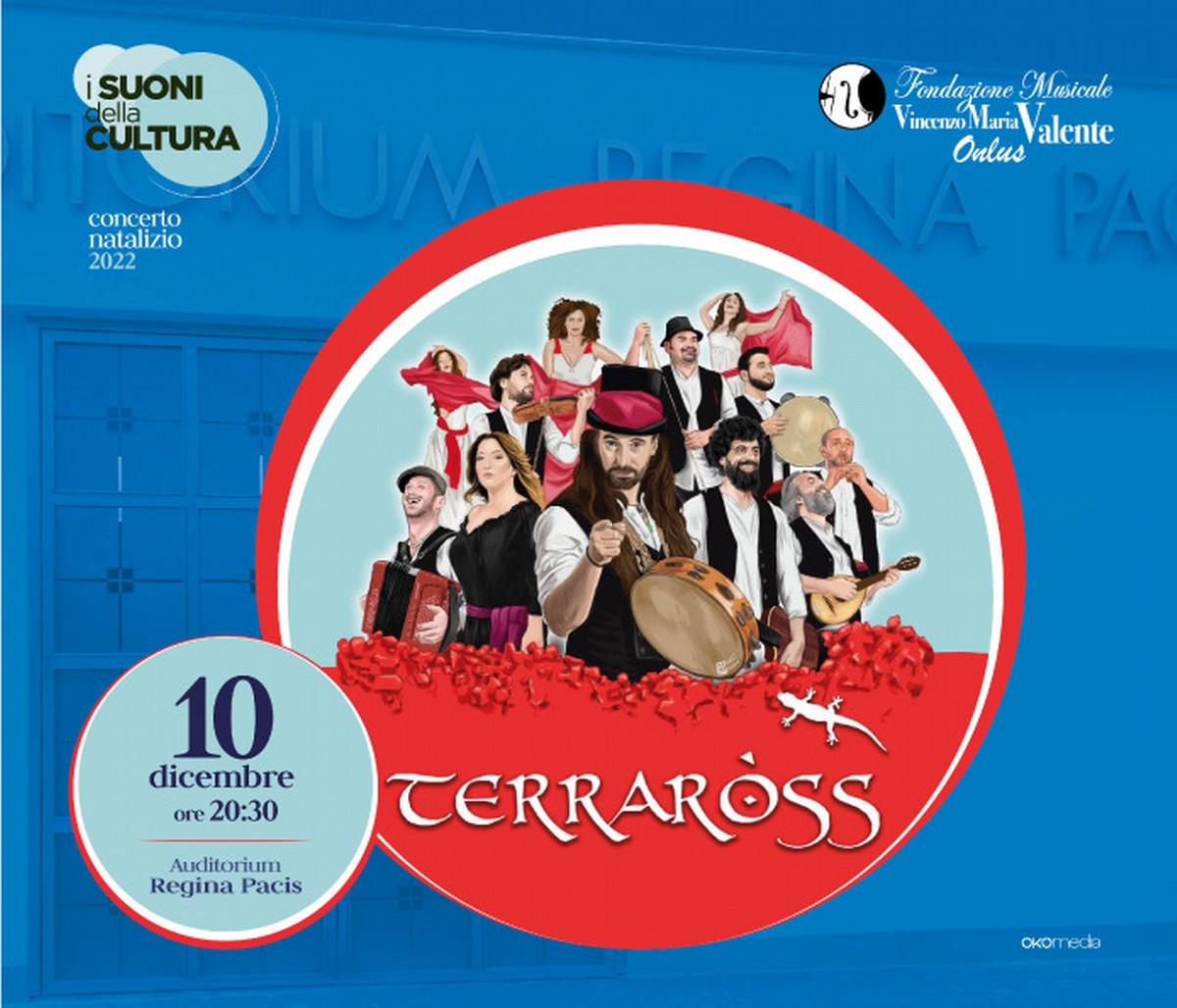 È una vera chicca il prossimo evento della Fondazione Valente di Molfetta: il 10 dicembre, infatti, nell'Auditorium Regina Pacis di Molfetta, alle ore 20.30, si esibirà il gruppo "Terraròss" e risuoneranno le note inconfondibili della tarantella nostrana portata in tutto il mondo dai suonatori e menestrelli della Bassa Murgia.