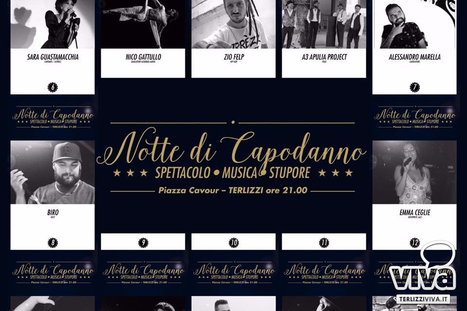 Il prossimo 31 dicembre Terlizzi saluterà lo scivolare via del 2015 e brinderà all'inizio del 2016 sulle note dell'evento dal titolo "Notte di Capodanno – spettacolo, musica, stupore", organizzato da "Bag Eventi". Teatro di questa manifestazione sarà l'antica Piazza Cavour. Proprio come accade per i grandi eventi i nomi dei partecipanti all'evento trapelano di volta in volta. Si tratta tuttavia di informazioni ancora incomplete in quanto gli organizzatori divulgheranno la scaletta integrale ed approfondita dell'evento solo in occasione della conferenza stampa di presentazione del concerto, che si svolgerà nei prossimi giorni.