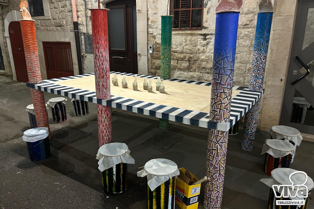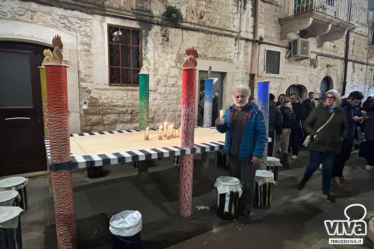 A completare lo splendido scenario, l'opera di Paolo De Santoli realizzata con la collaborazione dei suoi studenti: la grande Tavola del Gallo per accogliere tutti, una comunità di conoscenti, ma anche sconosciuti. «Il Gallo - ci spiega l'artista - presente nella simbologia pagana e poi cristiana, è un simbolo solare della ciclicità del tempo che per Nietzsche è "eterno ritorno" e nell'Antico Testamento l'espressione "vecchio e sazio di giorni" – i galli che presidiano la tavola sono l'augurio di vivere con pienezza ogni momento anche quello conviviale abbandonando la frenesia per vivere l'attimo col parente, col conoscente o con lo sconosciuto». "Convivio Sonoro" è la tavola dell'incontro, del riconoscimento ed è su questi temi che gli allievi di ceramica del liceo Artistico Corato coordinati da RA ContemporaryArtTerlizzi hanno progettato ed eseguito per un arredo della tradizione, che è passione ma anche design, dove la ceramica ricopre il suo vecchio ruolo.