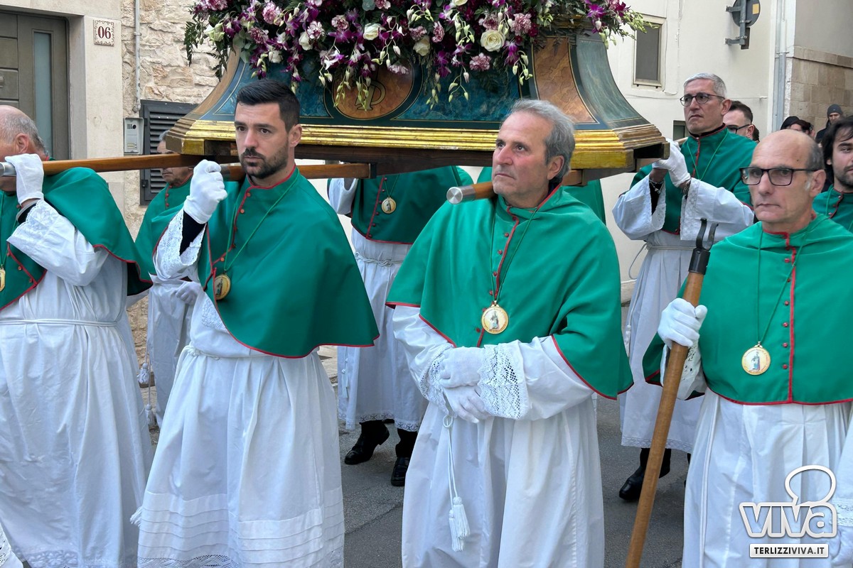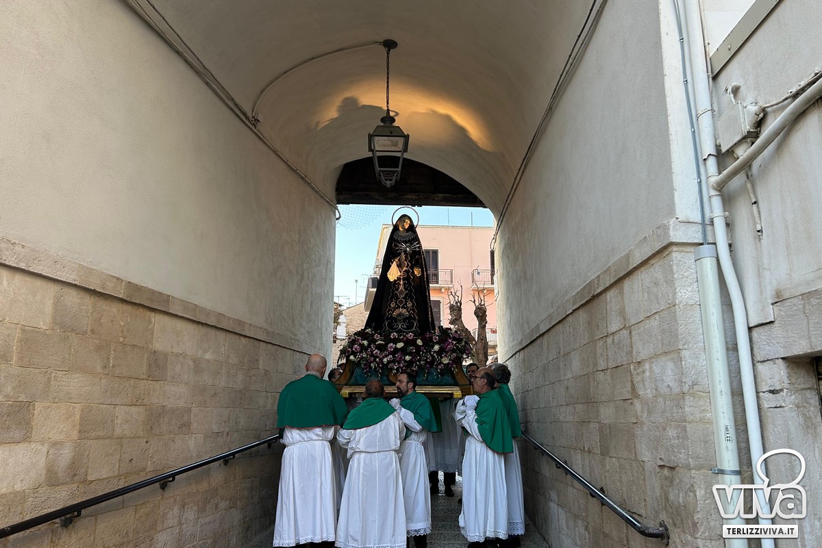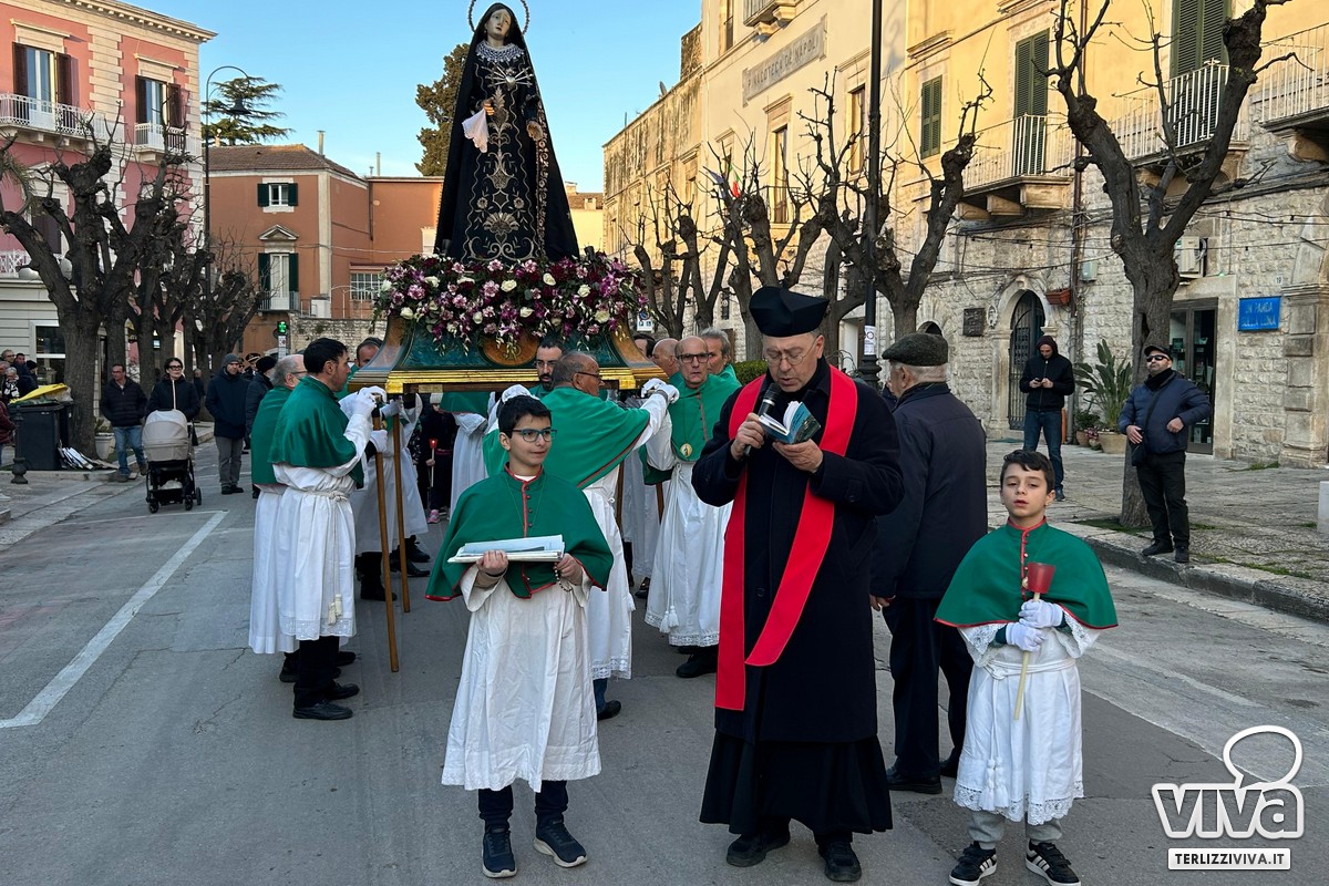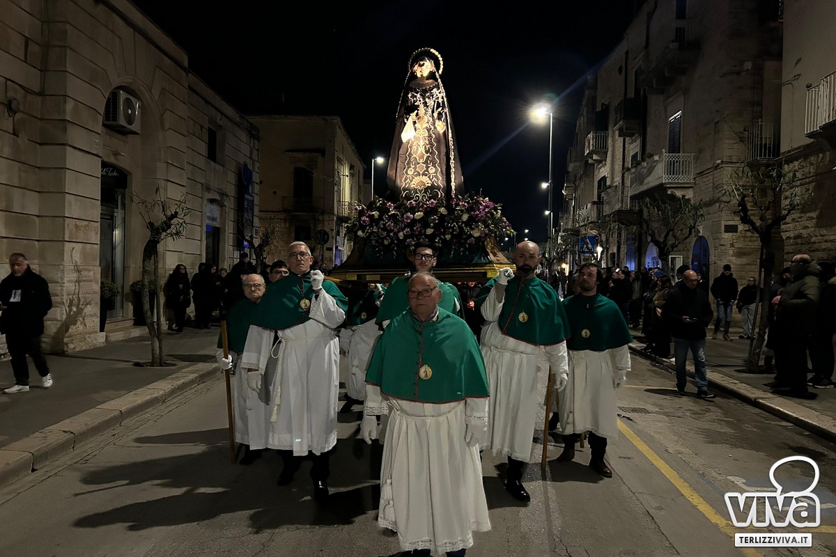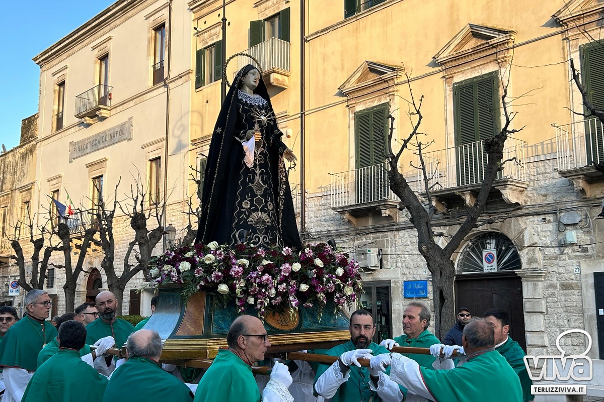 Dopo il rinvio imposto dal forte maltempo che aveva interessato il Venerdì di Passione, nella domenica delle Palme, ieri domenica 29 marzo, si è finalmente svolta a Terlizzi la processione del simulacro della Beata Vergine Maria Addolorata, che, anche quest'anno ha richiamato numerosi fedeli lungo le strade cittadine.