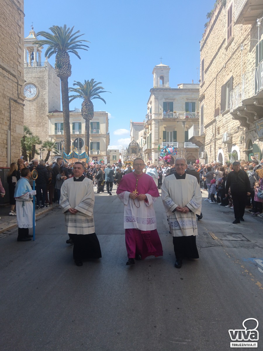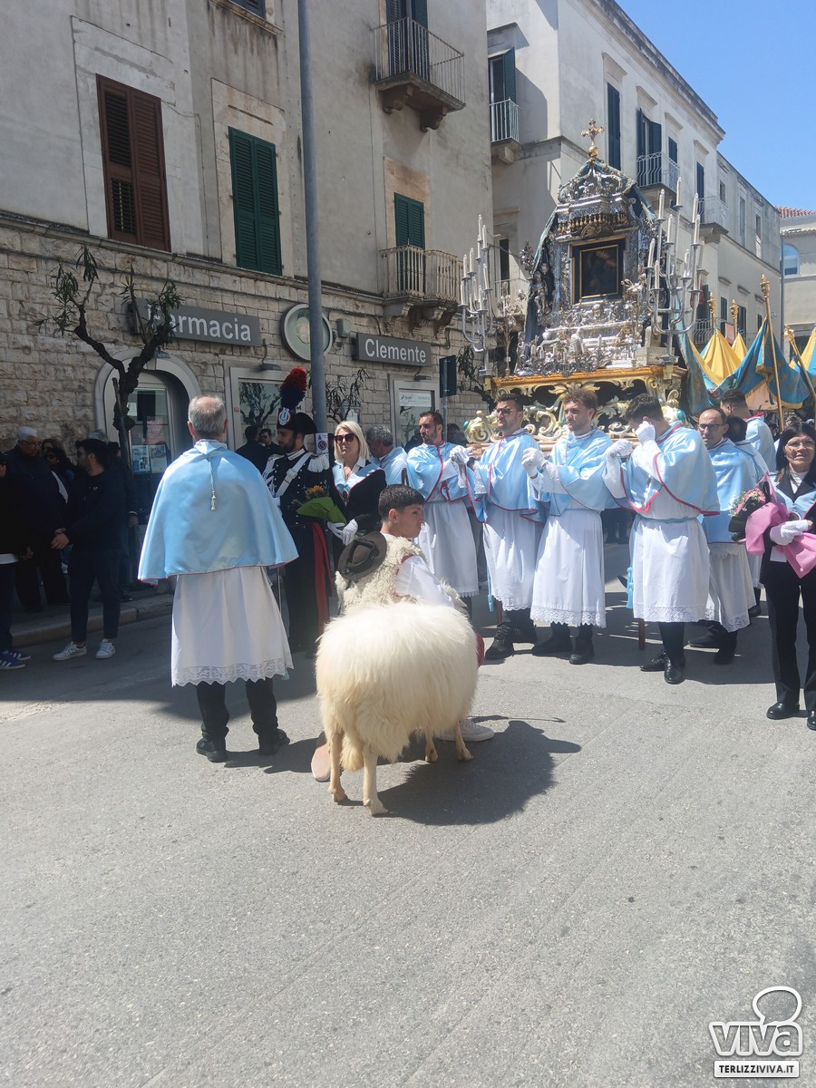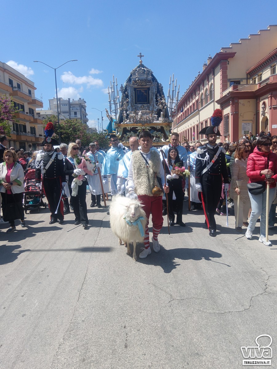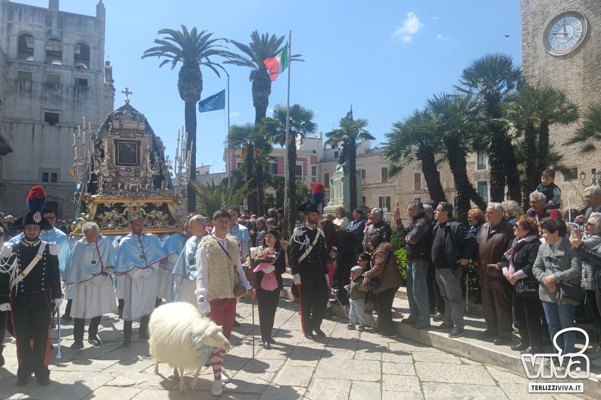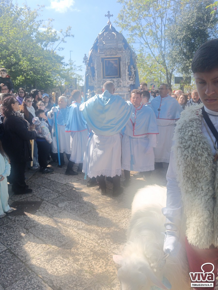 La processione per le vie di Terlizzi, che ha portato dalla Concattedrale di San Michele Arcangelo alla chiesa della vecchia Santa Maria della Stella è partita dopo il pontificale presieduto da S.E. Mons. Domenico Basile. Due ali di folla si sono aperte al suo passaggio, con la pecorella Pace, simbolo della leggenda che racconta il culto mariano a Terlizzi, insieme al pastorello, ad aprire il corteo processionale.