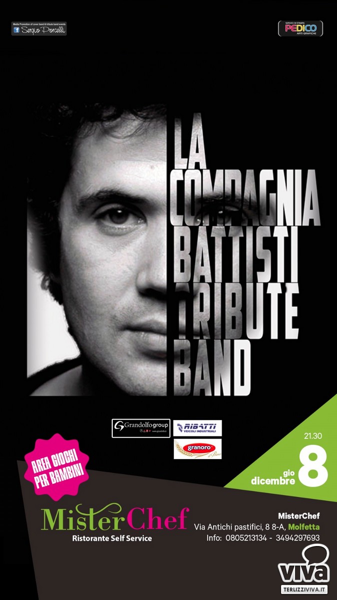 L'8 dicembre, start ore 21.30, ad esibirsi sarà "La Compagnia", la tribute band dedicata a Lucio Battisti e Mogol. Si tratta di una band composta da musicisti di grande talento, cresciuti ascoltando le canzoni del grande Lucio Battisti.Alla voce Nataniele Fabbri, un cantante polistrumentista in grado di arricchire le performance con chitarra e flauto traverso. Ad accompagnarlo le due coriste, Debora Silvestri e Sara Lombardini. Le tre voci sono supportate da Costa Cervone alle chitarre, Vincenzo Piacquadio e Lorenzo Lucchi alle tastiere, Cristian Perrazini al sax, Massimo Perli al basso e Andrea Bianchi alla batteria. Il repertorio de "La Compagnia" vanta al suo interno tutti i più grandi successi della grande collaborazione tra Lucio Battisti e Mogol.