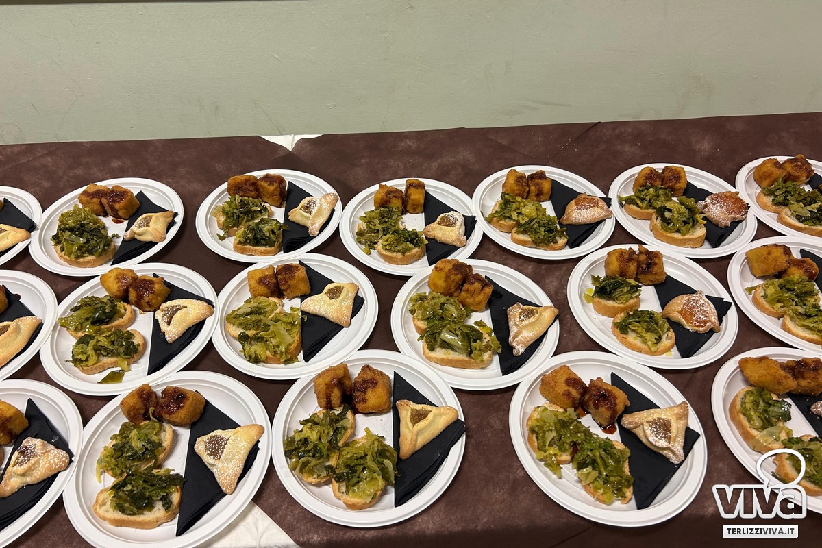 I sapori medievali proposti nel banchetto che, ha coinvolto tutti i partecipanti alla serata, sono stati i seguenti: tagliatelle con mollica sfritta di pane raffermo e vino cotto; crostone tostato con cavolo e cime di rapa stufati; orecchie di Haman, si tratta di dolci ebraici triangolari ripieni di marmellata di fichi; vino speziato; infine, bevande medievali a base di erbe naturali.