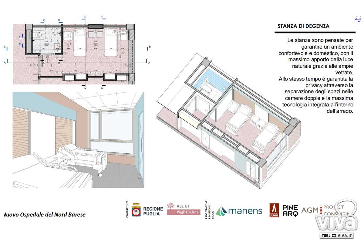 Il nuovo ospedale ospiterà 268 posti letto, di cui 25 tecnici, e beneficerà di un finanziamento totale di euro 192.500.000: sarà dotato di area medica, area chirurgica, area materno-infantile, area intensiva, area malattie infettive, pronto-soccorso, posti letto tecnici, lungodegenza e psichiatria. Ci saranno naturalmente il blocco diagnostico, il blocco operatorio, il blocco parto, blocco ambulatoriale, blocco servizi, area per il personale e area accoglienza. Il progetto, realizzato nel pieno rispetto dell'ambiente circostante è composto da un corridoio centrale e da 4 blocchi rettangolari: sono previsti 3 ingressi e percorsi di accesso organizzati per i visitatori, per i sanitari e per l'area di emergenza-urgenza. Le stanze di degenza saranno realizzate con ampie vetrate per recuperare la luce naturale, ampiamente garantita anche nell'ampia zona di ingresso. "Siamo orgogliosi e soddisfatti – ha detto Tiziana Dimatteo, commissario straordinario Asl Bt – il progetto del nuovo ospedale del Nord barese è ambizioso, moderno, rispettoso delle esigenze di organizzare l'assistenza per intensità di cura. In questo momento siamo in fase di completamento delle verifiche da parte del CAB Asset sui rilievi effettuati. Entro novembre sarà consegnato il progetto definitivo per l'ammissione al finanziamento e l'avvio della gara integrata per la realizzazione del progetto definitivo e dei lavori".In base agli indirizzi programmatori il dimensionamento della struttura non è stato determinato come una semplice somma delle capacità dei reparti in chiusura o alla riproduzione dell'attuale configurazione accreditata, ma è stato basato su un'attenta analisi della popolazione target, dei suoi bisogni sanitari presenti e futuri e del contributo che il Nuovo Ospedale apporterà al rafforzamento della rete assistenziale ed al recupero di mobilità passiva. Il dimensionamento previsto per il Nuovo Ospedale, dotazioni e spazi necessari, permetterà dunque non solo di erogare l'attività presente ma di potenziarne i volumi.